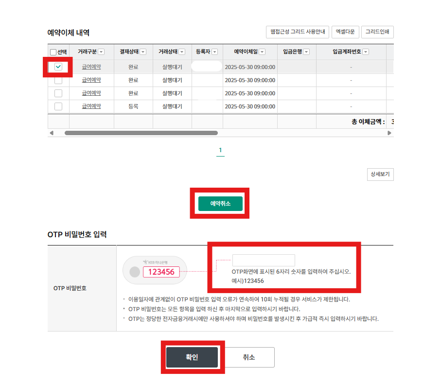이제 취소할 예약이체내역을 선택한 후에 예약 취소를 눌러줍니다.