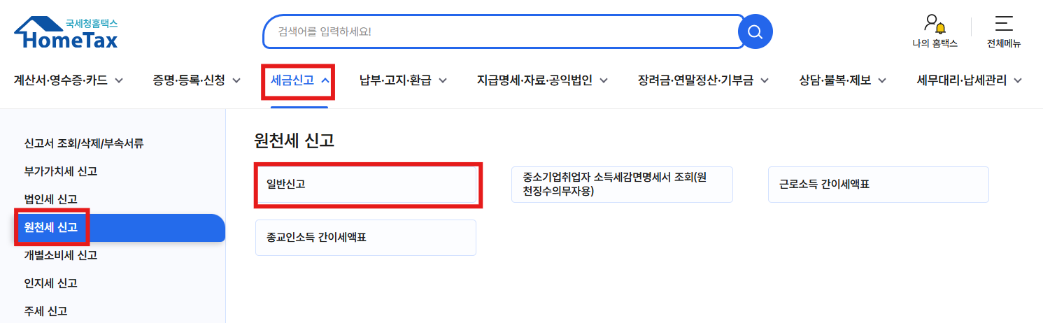 [ 공동인증서 로그인 > 세금신고 > 원천세신고 > 일반신고 ] 메뉴로 들어가 줍니다.