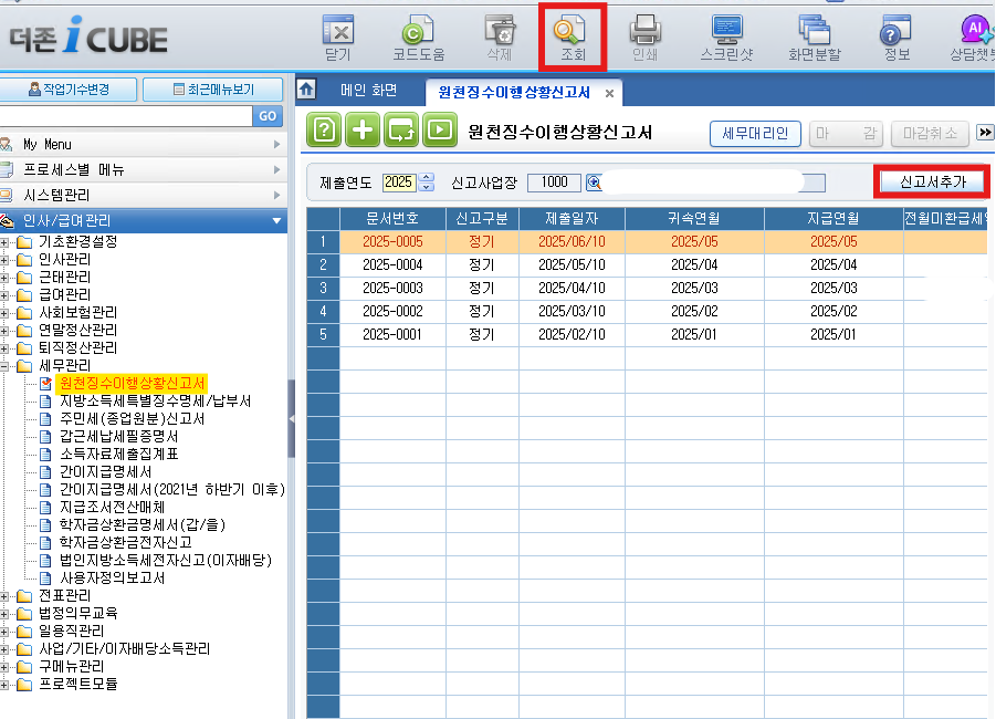 [ 인사/급여관리 > 세무관리 > 원천징수이행상황신고서 ] 메뉴로 들어가서 [조회]를 누르면 신고된 문서를 확인할 수 있습니다. 여기서 [신고서추가] 버튼을 눌러 신고서로 이동합니다.
