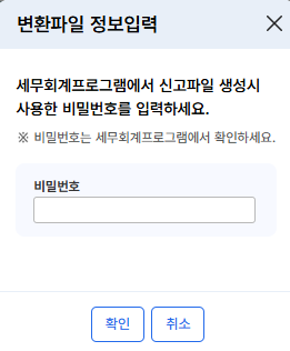 형식 검증하기를 누르면 비밀번호 입력창이 뜨는데, 여기서 비밀번호는 아까 더존에서 파일제작했을 때 적었던 비밀번호 입니다.