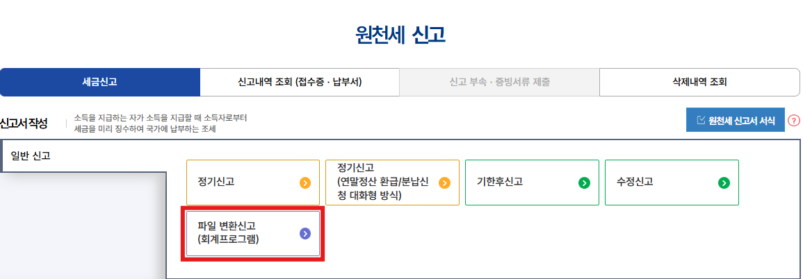 우리는 회계프로그램을 이용한 파일 변환신고를 할 거니까 [파일변환신고]를 눌러줍니다.