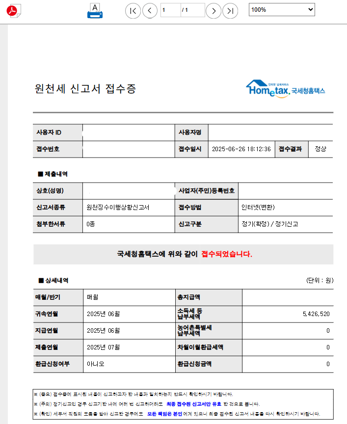 이제 원천세 신고가 완료되었습니다.