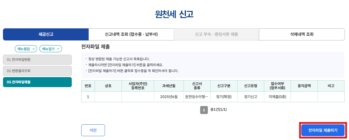 혹시나 오류가 있을 경우 오류 납세자수에 뜨니까 만약 이게 뜰 경우엔 오류납세자수 1을 클릭하면 오류 내용을 보실 수 있습니다.