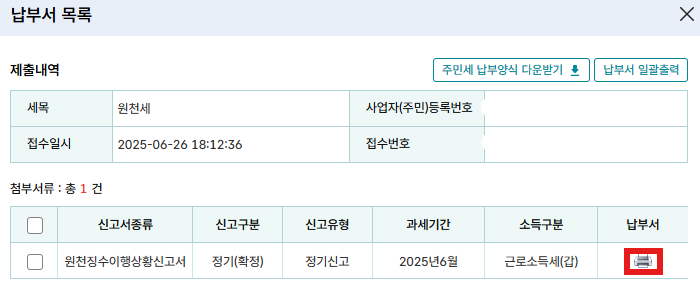 하나하나 인쇄눌러주시면 됩니다. 이 사업장은 근로소득세 뿐이어서 근로소득세만 1건이 표시되었습니다.
