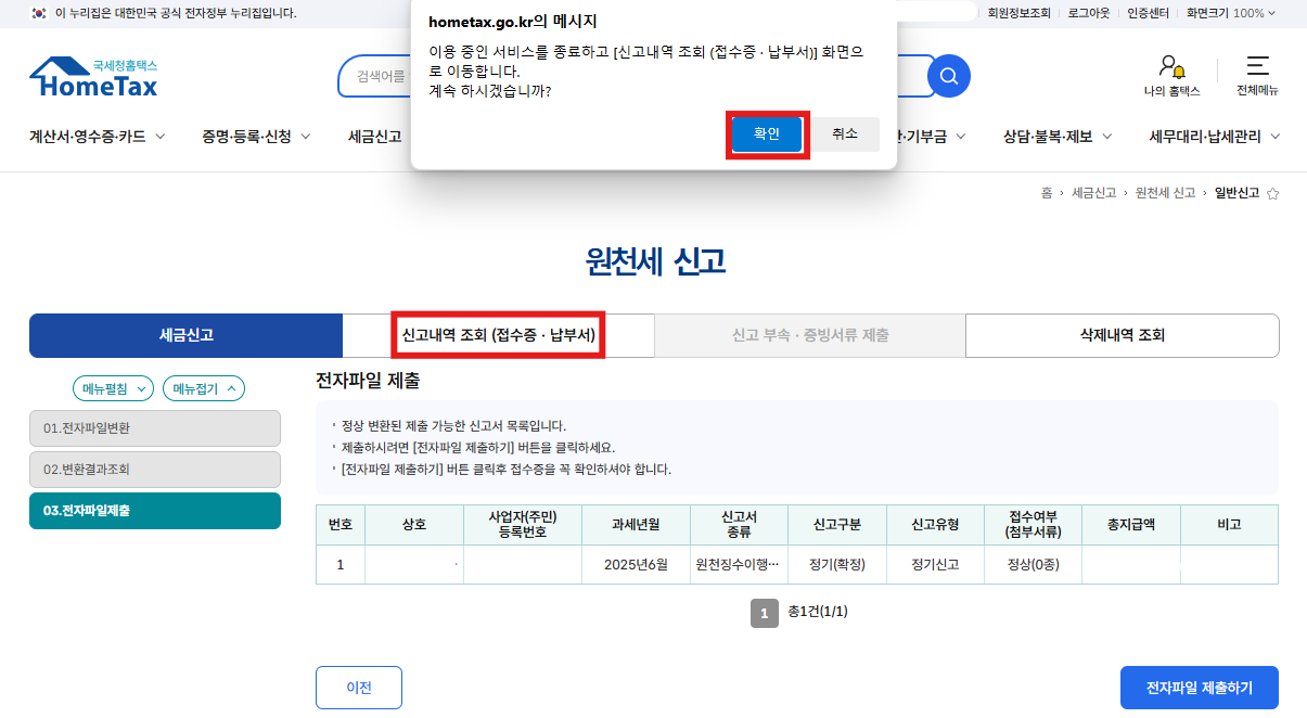 접수증 보기. 납부서 보기를 눌러 출력하세요. 원천세신고서를 보려면 접수번호를 클릭하면 볼 수 있습니다.