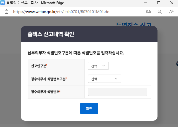 아래처럼 새로운 페이지가 아니라 팝업창처럼 뜨고 홈택스 신고내역 확인을 위해 입력하고 확인을 누르면 로그인됩니다.
