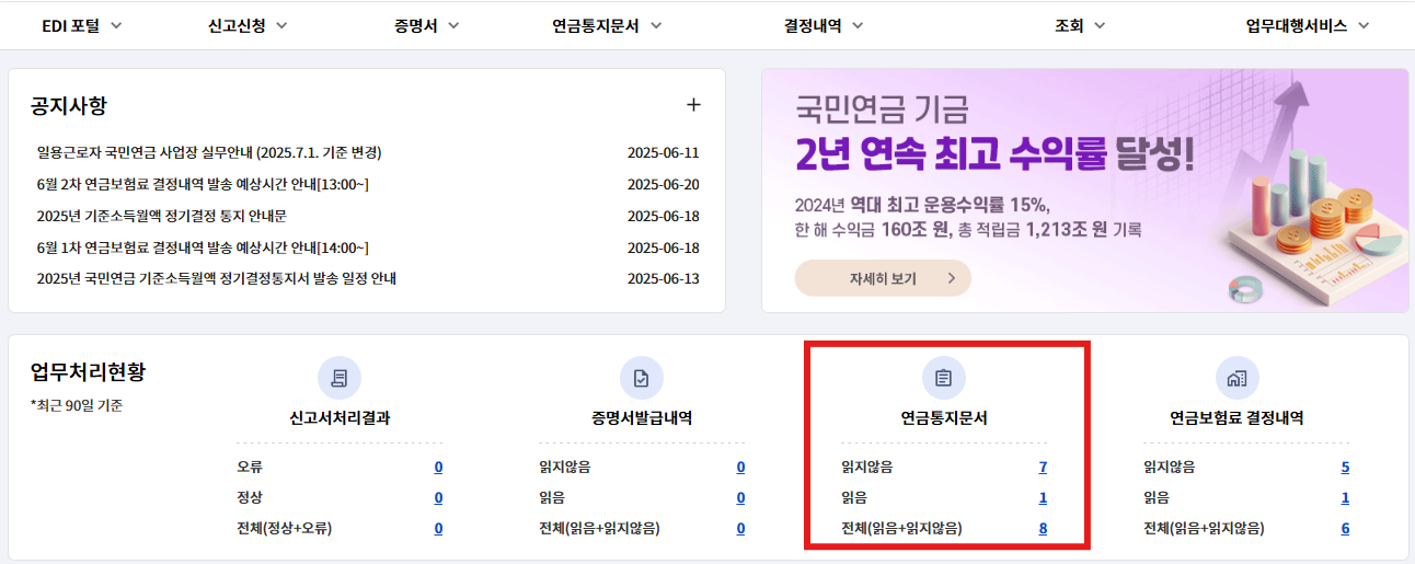 국민연금 EDI에 접속하여 7월에 나올 국민연금 보험료를 같이 확인해보겠습니다.