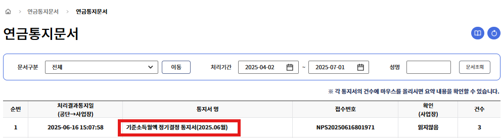 그러면 6월 16일쯤에 기준소득월액 정기결정 통지서(2025.06월)이 와있는 것을 볼 수 있을 것입니다.