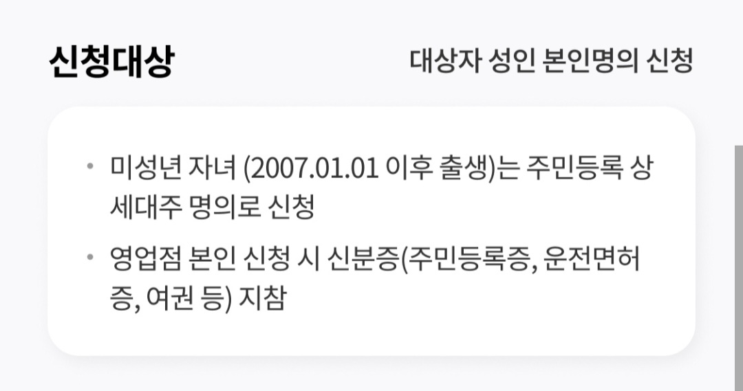 * 영업점 본인 신청 시 신분증 (주민등록증, 운전면허증, 여권 등) 지참