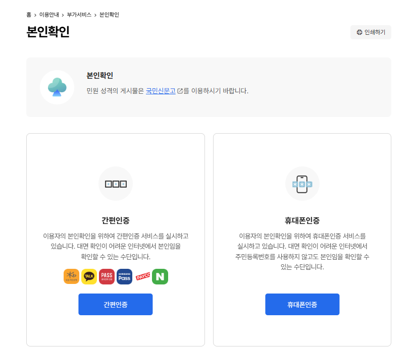 상담 등록을 누르면 아래와 같이 본인인증하라고 경고창이 뜨고 간편인증, 휴대폰인증 등으로 본인인증하고 들어갑니다.