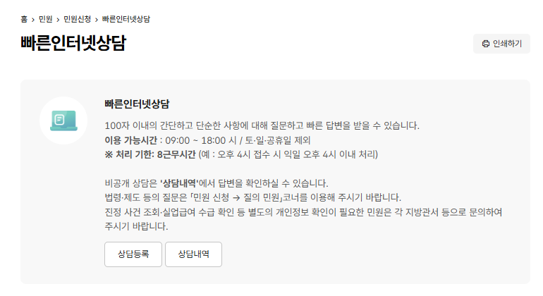 만약 100자 이상, 좀더 복잡하고 어려운 질문이고 퀄리티 있는 답변을 받고싶다면 국민신문고 상담으로 가야하는데, 여긴 답변이 아주 느립니다. 답변을 늦게 받아도 된다 생각하시면 여기 사이트도 괜찮습니다.