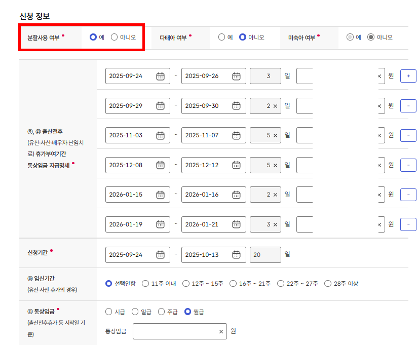 이분은 분할사용을 신청하셔서 분할사용여부에 "예" 체크표시하고, 신청한 기간을 평일 기준으로 나눠야 합니다.