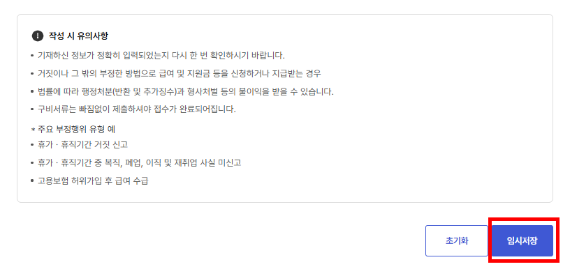 다 작성했으면 임시저장 -> 자료 확인한 후 -> 제출 버튼을 순서대로 누릅니다.